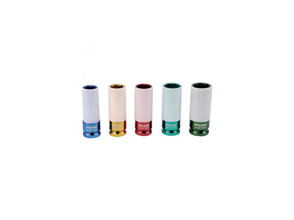 Prodloužené rázové nástrčné hlavice 1/2" pro kola z lehkých slitin - velikost 17 mm - délka 85 mm - modrá Tenkostěnné prodloužené nástrčné hlavice s plastovými objímkami pro práci bez rizika poškození disků z lehkých slitin. Jednodušší rozlišení správné velikosti díky různým barvám hlavic.Doplňkové parametry