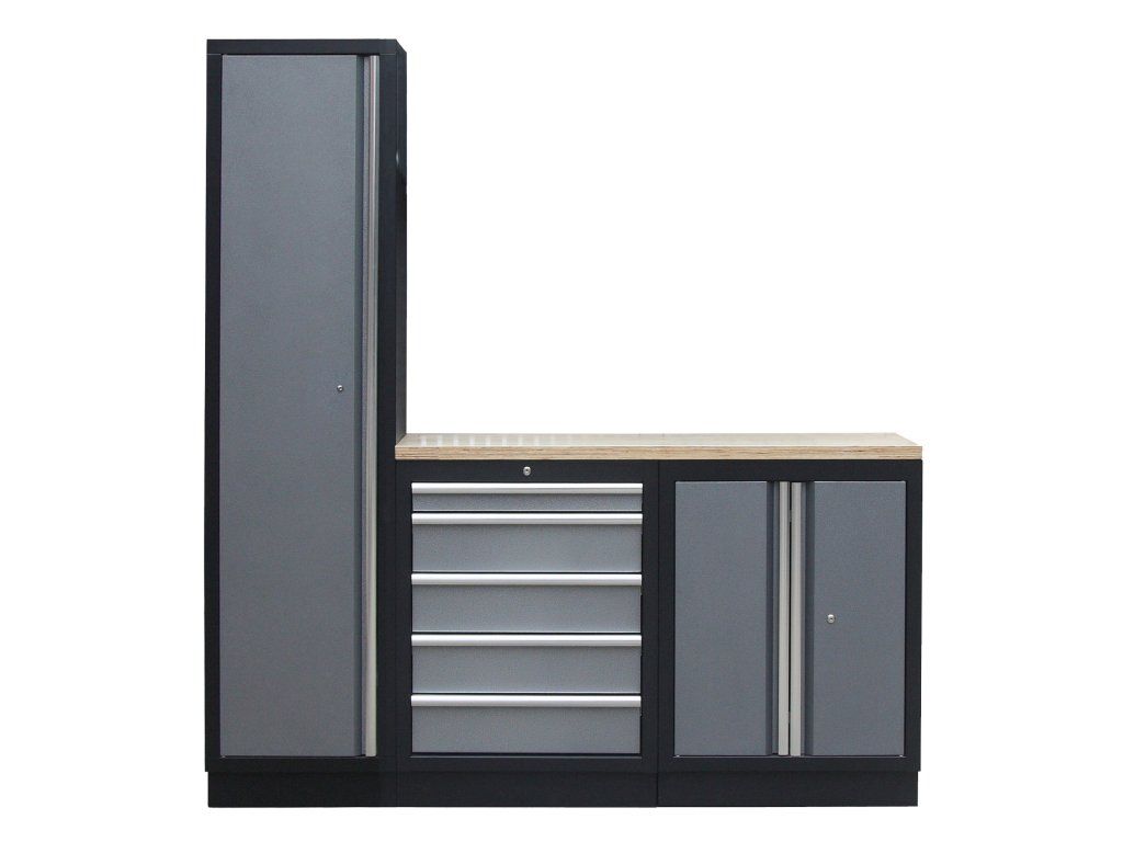 Sestava nábytku v sobě skrývá dostatečné množství úložného prostoru pro vaše nářadí, autotechniku i dílenské vybavení. V kombinaci s bytelnou pracovní deskou získáte multifunkční stěnu, se kterou vám půjde práce od ruky ve všech směrech.