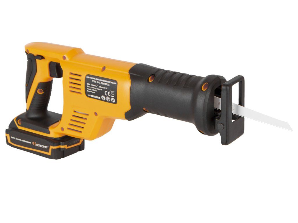 AKUmulátorová pila ocaska od značky Hoteche napájena akumulátorem 20 V 2 Ah.