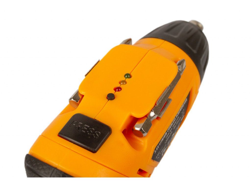 O pohon se stará vestavěný 3,6 V Li-Ion akumulátor s kapacitou 1300 mAh. Na horní části šroubováku se nachází ukazatel stavu baterie, díky kterému budete mít vždy přehled o stavu nabití, magnetický držák bitů a aretační tlačítko pro změnu polohy.