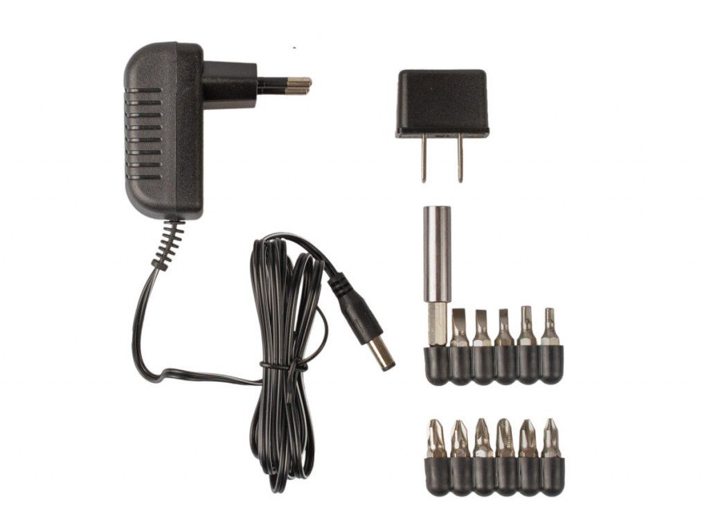 Balení se skládá z 11 ks krátkých (25 mm) a 2 ks delších (50 mm) bitů, magnetického adaptéru a nabíječky.