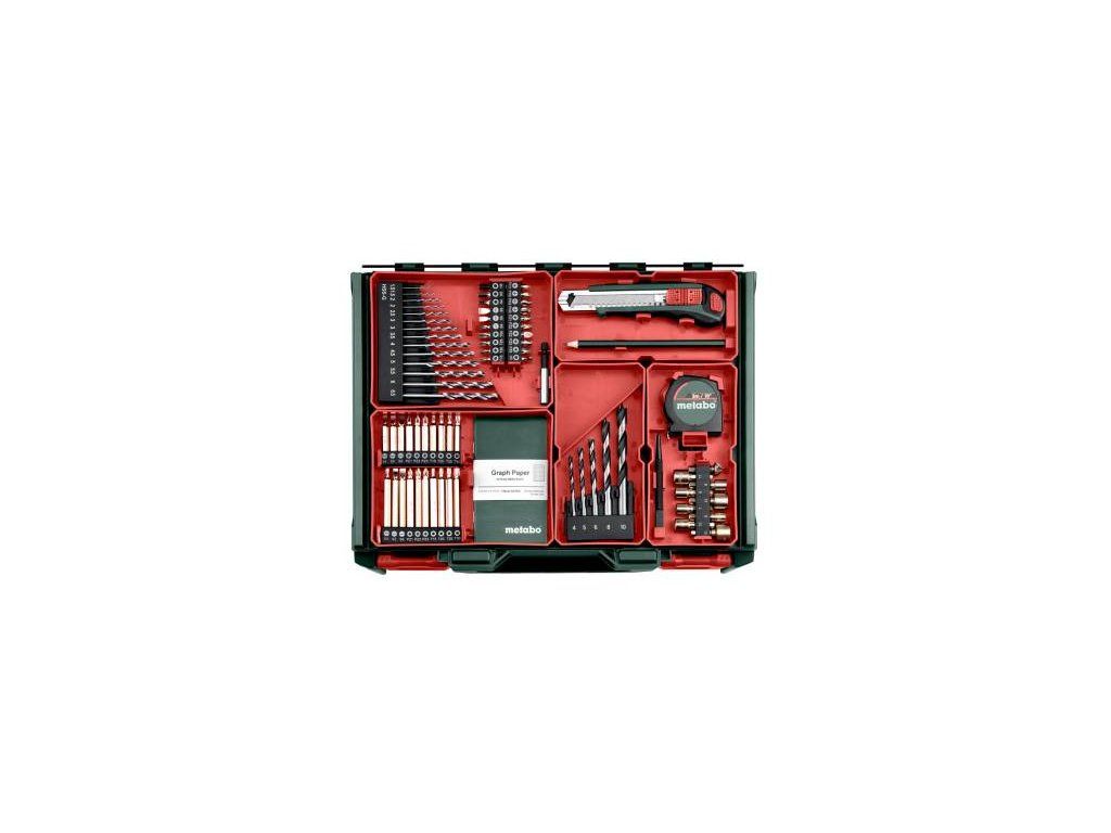- Mobilní dílna (74 kusy): 5 vrtáků na dřevo (4/5/6/8/10 mm), 14 vrtáků HSS (1,5/1,5/2/2/2,5/3/3/3,5/4/4,5/5/5,5/6/6,5 mm), 20 šroubovacích bitů délky 25 mm (PH1/PH2/PH2/PH3/PZ1/PZ2/PZ2/PZ2/PZ3/H3/H4/H5/H6/T15/T20/T25/T30/S4/S5/S6), 10 šroubovacích bitů délky 50 mm (S4/S5/S6/PZ1/PZ2/PZ3/T15/T20/T25/T30), 10 šroubovacích bitů délky 75 mm (S4/S5/S6/PZ1/PZ2/PZ3/T15/T20/T25/T30), držák bitů (60mm), 8 nástrčných klíčů (6/7/8/9/10/11/12/13 mm), záhlubník do dřeva (12,7 mm), středicí kolík (5x100 mm), řezací nůž se 2 náhradními čepelemi, svinovací metr (3 m/10"), tužka (HB), blok