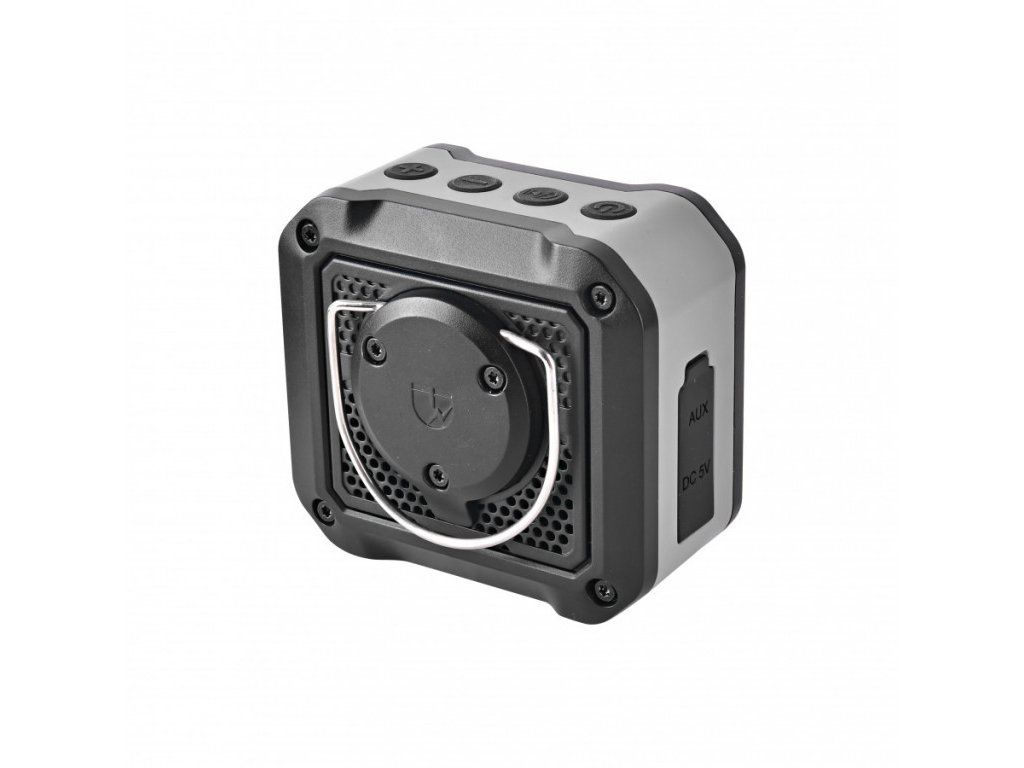 Tento malý praktický přenosný reproduktor je vodotěsný (IP55). IP55 označení znamená částečná odolnost vůči prachu a ochrana reproduktoru vůči tryskající vodě.
