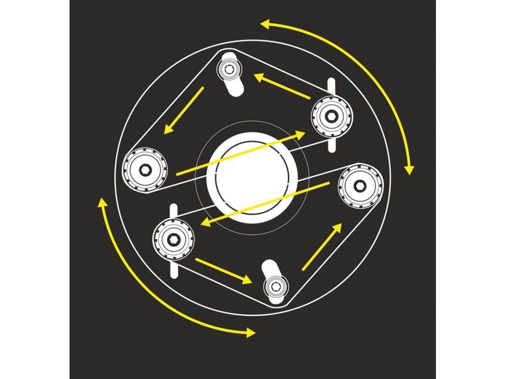 - Dva brusné pásy běžící v opačných směrech na otočné hlavě, není třeba obrobek otáčet