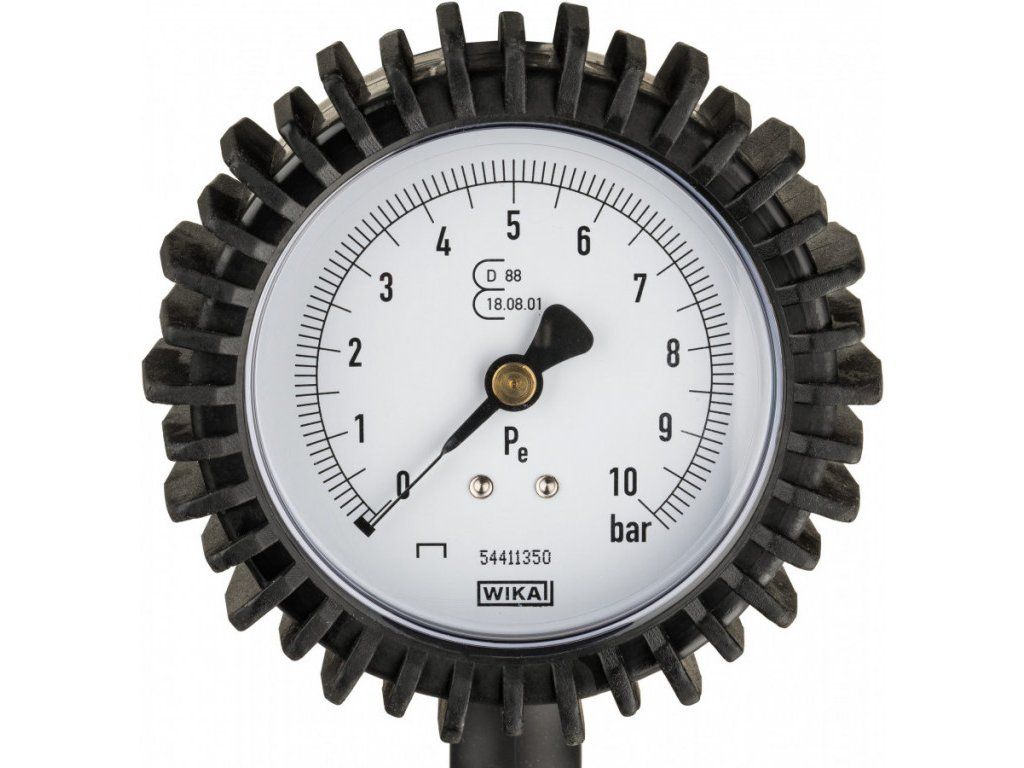 - Cejchovaný manometr s rozsahem 0–10 bar a dělením 0,1 bar.