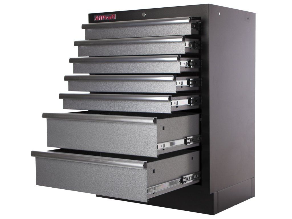 Celokovová dílenská skříň se 7-mi zásuvkami zajišťuje maximální přehled, úložnou kapacitu a odolnost i v náročném provozu.