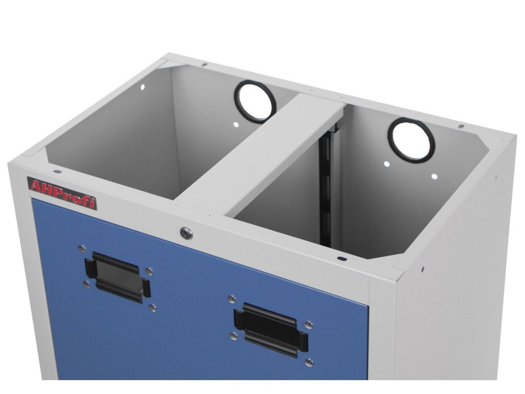 Celokovová PROFI BLUE dílenská dvoukřídlá skříňka s otvory pro uskladnění samonavíjecích bubnů na vzduch (XBA02) nebo elektřinu (12 m, 20 m).