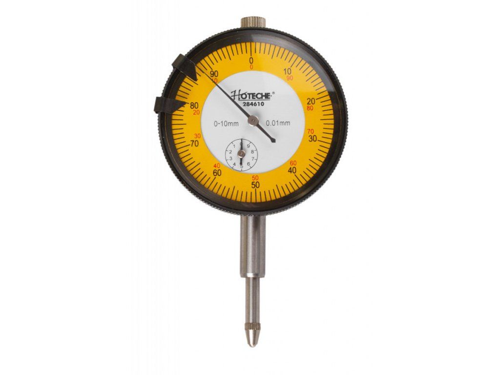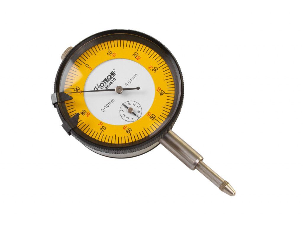 Číselníkový úchylkoměr s rozsahem 0 - 10 mm a přesností 0,01 mm.