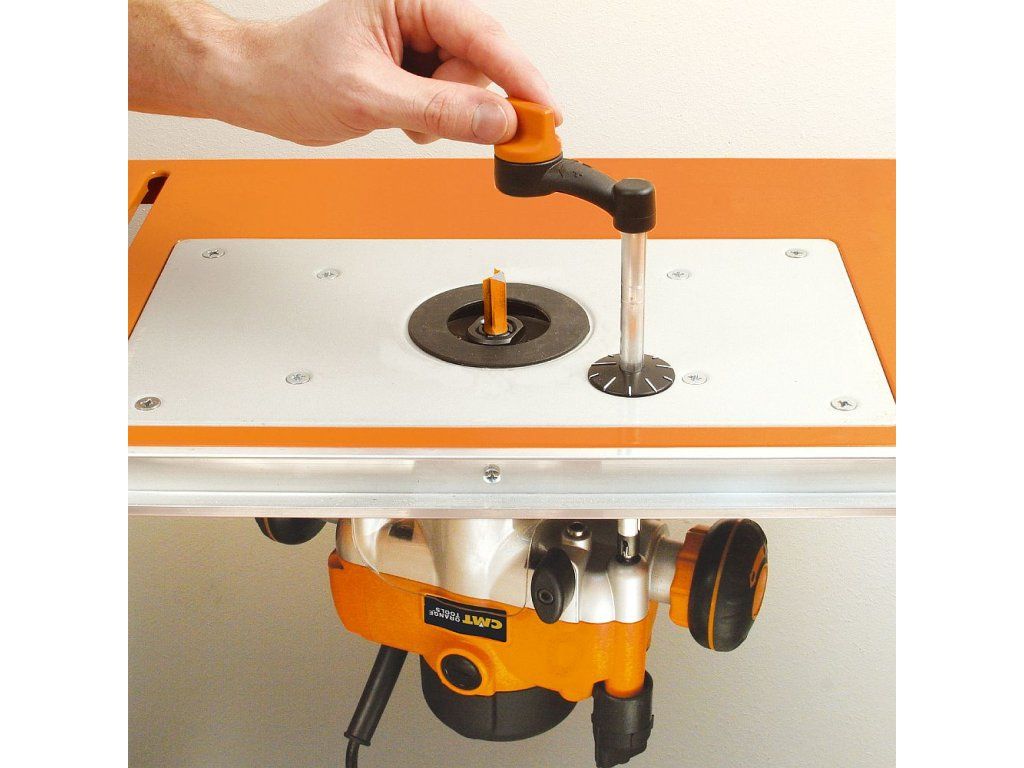 U obou typů CMT frézek lze nastavit výšku frézování ve frézovacím stolku shora pomocí ruční kliky.