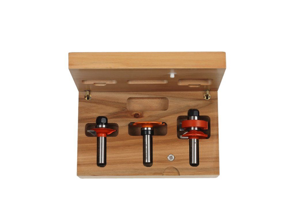 Ekonomicky výhodná sestava fréz obsahuje 3 kusy fréz – profil a kontraprofil pro rám výplně a frézu pro drážku na sklo.