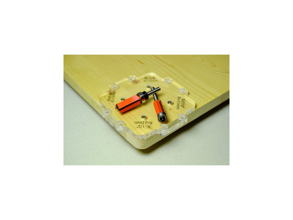 Užitečný třídílný set šablon obsahuje 8mm silné akrylové šablony, které umožňují vytvářet 12 různých poloměrů za pomoci ořezávací nebo drážkovací frézy. Sada obsahuje 4 ustavovací kolíky a 4 šrouby. Kolíky použijte pro umístění šablony na obrobku, dále použijte čtyři šrouby pro její upevnění. Vyjměte ustavovací kolíky a použijte stopkovou frézu pro odfrézování rohu obrobku podle šablony.