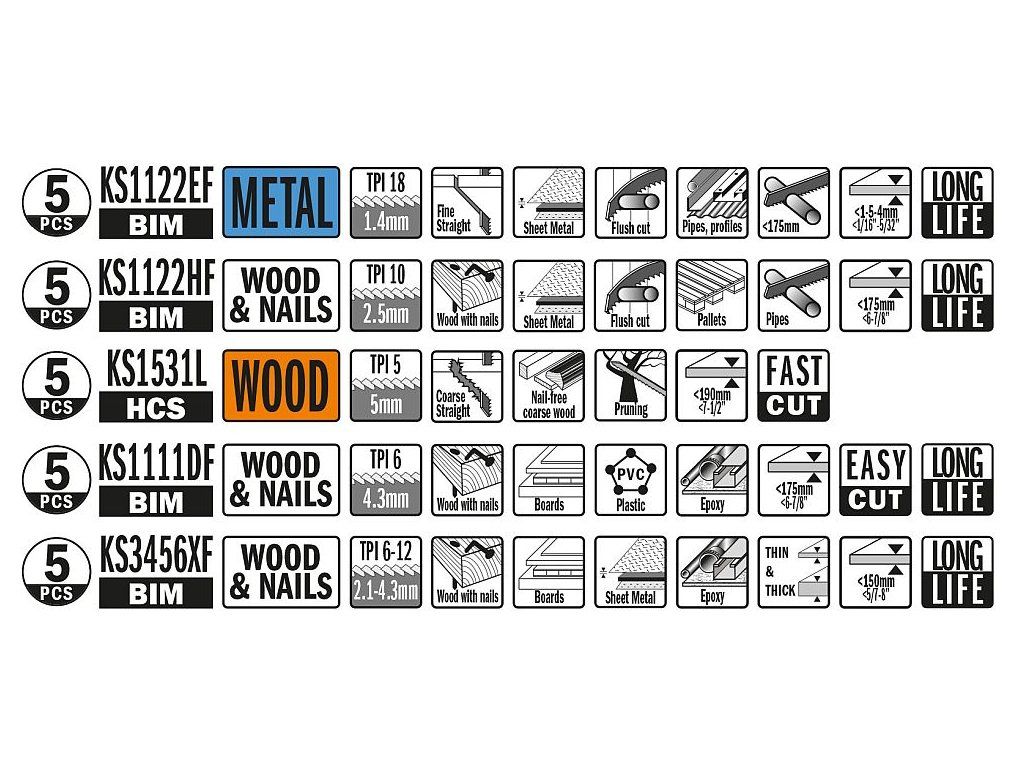 Sada 25 kusů obsahuje 5 nejpopulárnějších pilových listů pro pily ocasky. Sada je složena z pilových listů vhodných pro různé materiály: • KS1122EF – Tenký plech (1,5-4 mm), trubky a profily (průměr <175 mm). S jemným řezem. • KS1122HF – Oprava palet, dřevo s hřebíky/kovem (<175 mm), plech, trubky, hliníkové profily (3-12 mm). S jemným řezem. • KS1531L – Hrubé dřevo, bez hřebíků (<190 mm), prořezávání stromů (průměr <190 mm), palivové dřevo (průměr <190 mm). • KS1111DF – Dřevo s hřebíky/kovem, dřevotřískové desky o tloušťce <175 mm, plastové profily o průměru <175 mm, plasty a epoxidová pryskyřice vyztužené skleněným vláknem o tloušťce <50 mm. • KS3456XF – Dřevo s hřebíky/kovem, dřevotřískové desky o tloušťce <150 mm, plech, hliníkové profily o tloušťce od 3 mm do 18 mm, plasty a epoxidová pryskyřice vyztužené skleněným vláknem o tloušťce <150 mm.Doplňkové parametry