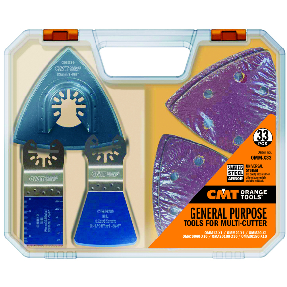 Víceúčelová sada pro multifunkční oscilační nástroje (33 kusů): • Ponorný pilový list pro řezání dřeva, plastu, sádrokartonu, plechu, profilů a plastových či hliníkových trubek. • Škrabka pro odstranění zbytků lepidel, barev a silikonů. • Brusná podložka a brusné papíry (hrubost 60, 100 a 180).