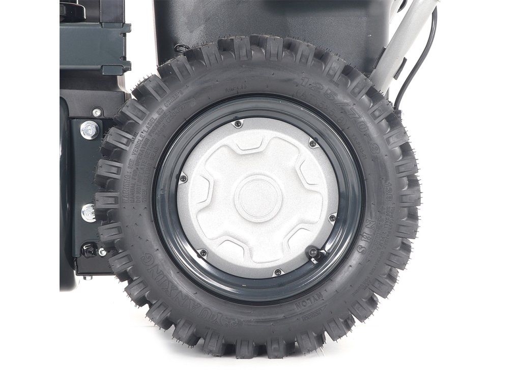 - Dvoustupňový odhazovací systém se šnekem z kalené oceli pro nabírání sněhu do přední části stroje a vysoce účinná turbína odhazuje nasbíraný sníh vyhazovacím komínkem