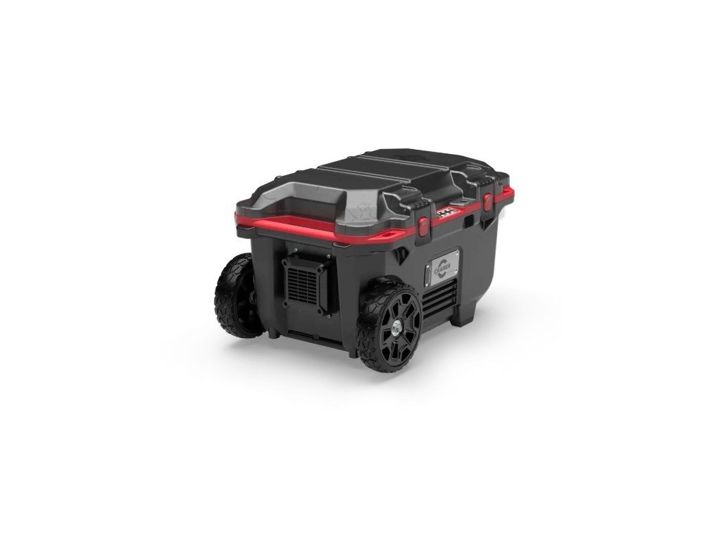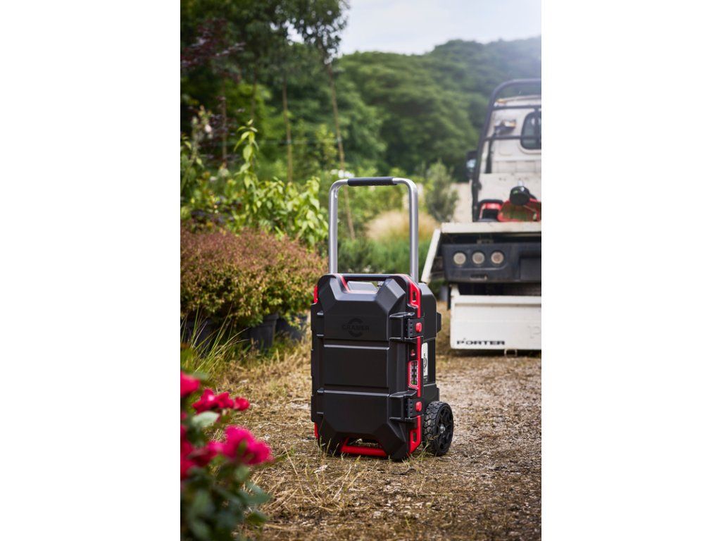 Všestranná mobilní stanice Caddy s velkými koly a výsuvnou rukojetí nabízí snadné řešení pro přepravu i správu vašich baterií.
