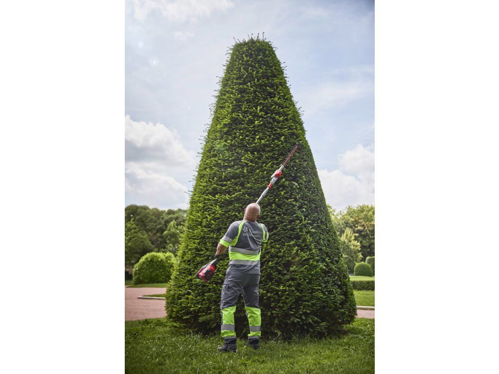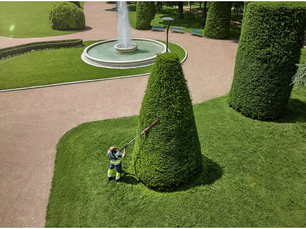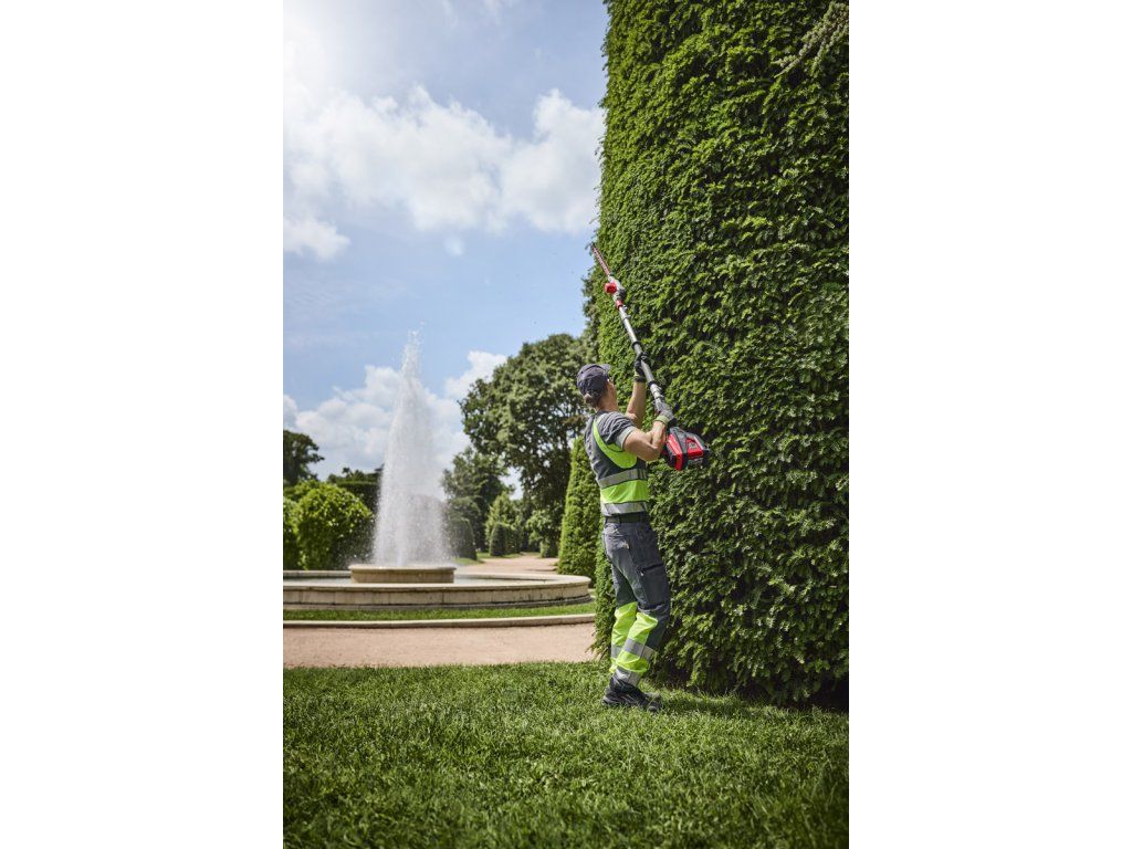 - Pro větší dosah slouží integrovaný zadní nárazník jako přídavná rukojeť při stříhání nejvyšších živých plotů