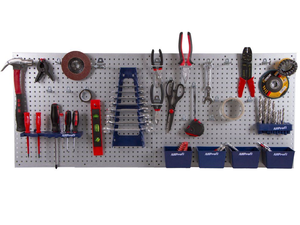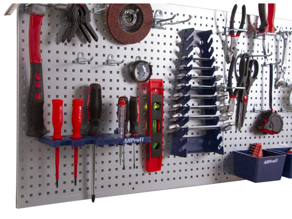Sada kovových děrovaných desek slouží k přehlednému a praktickému uložení nářadí tak, aby bylo vždy snadno dostupné a na očích.