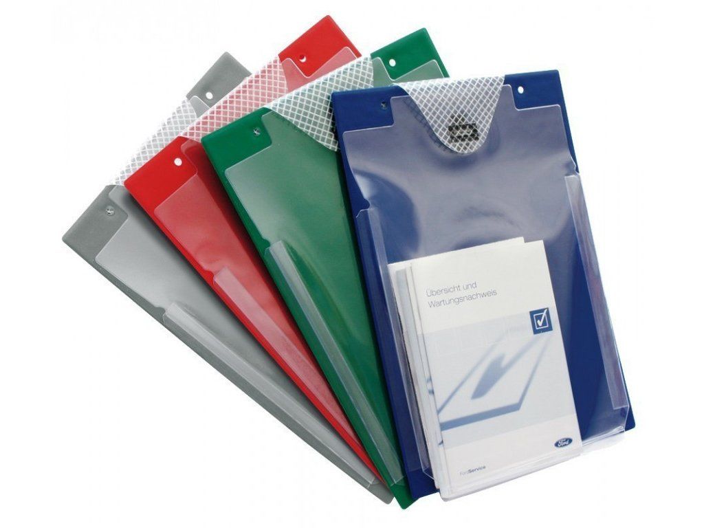 Na přední straně desek se nachází velká průhledná kapsa s vysokou pevností a bočním zapínáním pro vložení většího množství papírů nebo např. servisní knížky.