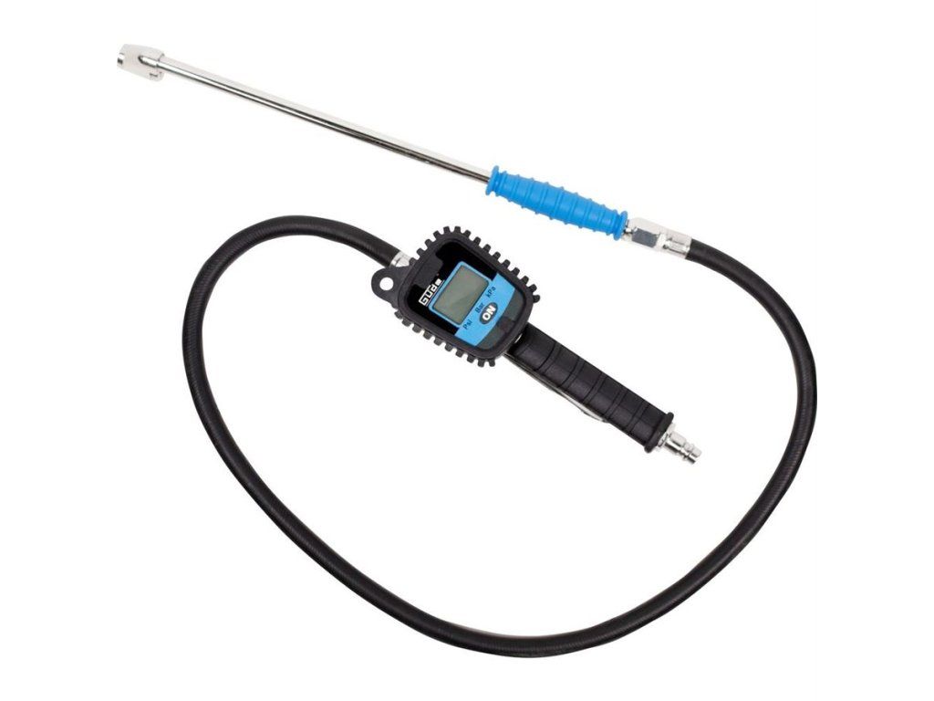 Tělo hustilky tvoří odolná rukojeť s pogumovaným povrchem a integrovaný digitální manometr chráněný gumovou manžetou.
