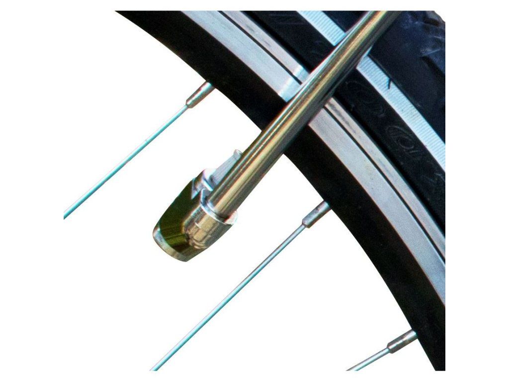 Vybavena dlouhou gumovou hadicí s pochromovanou koncovkou ventilu Michelin a praktickým prodloužením s dvojitým ventilovým konektorem.