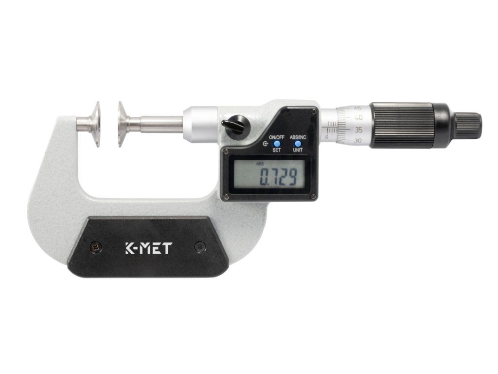 Digitální mikrometr na ozubená kola KINEX/K-MET 25-50 mm/0.001mm, NEW DESIGN, DIN 863. Vnější průměr talířku 20 mm.Doplňkové parametry