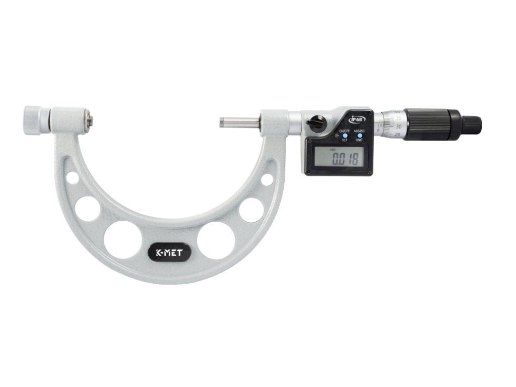 Digitální mikrometr třmenový KINEX/K-MET 800-900mm, 0,01mm, DIN 863, IP65. Přesnost 0,01mm. Součástí jsou nastavovací doteky 25mm, 50mm, 75mm, 100mm. Nastavovací tyčky 825mm, 875mmDoplňkové parametry