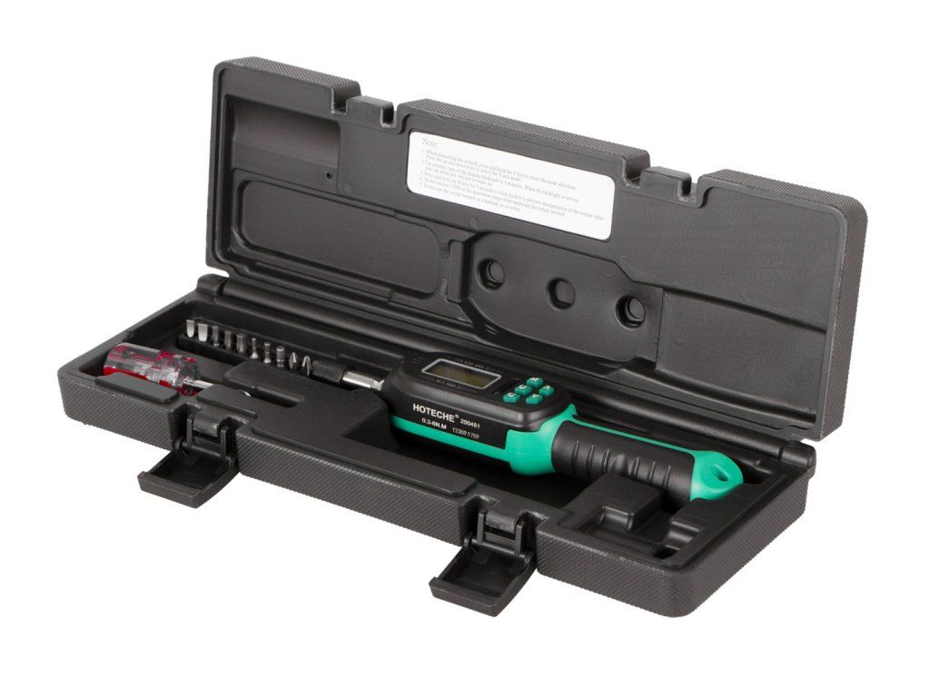 Digitální momentový šroubovák s pracovním rozsahem 0,3 - 6 Nm a sadou bitů.