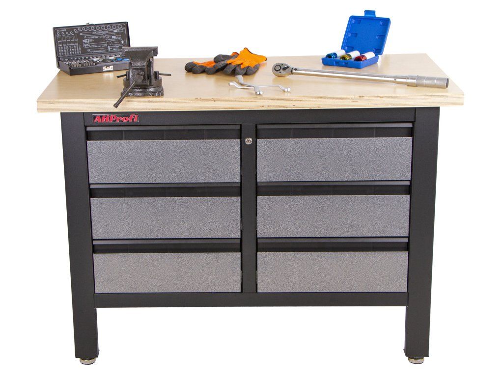 Stůl je vybavený dřevěnou pracovní deskou o rozměrech 1200 x 600 mm a obsahuje 6 uzamykatelných zásuvek.