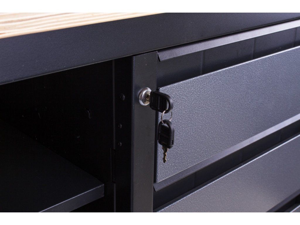 Uzamykatelná skříňka a zásuvky chrání nářadí před prachem i neoprávněným přístupem, otevřené regály poskytují rychlý přehled o obsahu. Po stranách jsou děrované desky pro zavěšení často používaného nářadí.