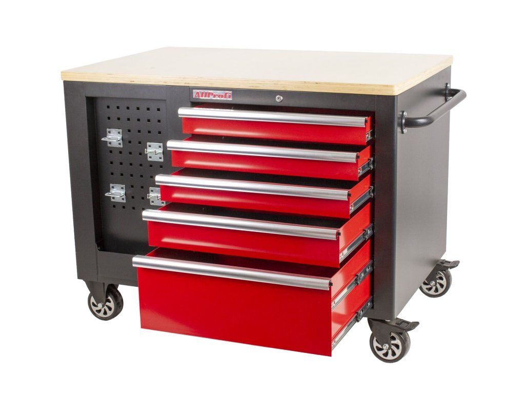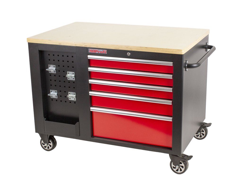 Na širších stranách vozíků jsou 2x děrované desky s přihrádkou, z jedné strany 5 zásuvek a z druhé dvoukřídlá skříňka se 2-mi poličkami. Na užších stranách se nachází dalších 5 zásuvek a madlo pro snadné manipulování s dílenských vozíkem.