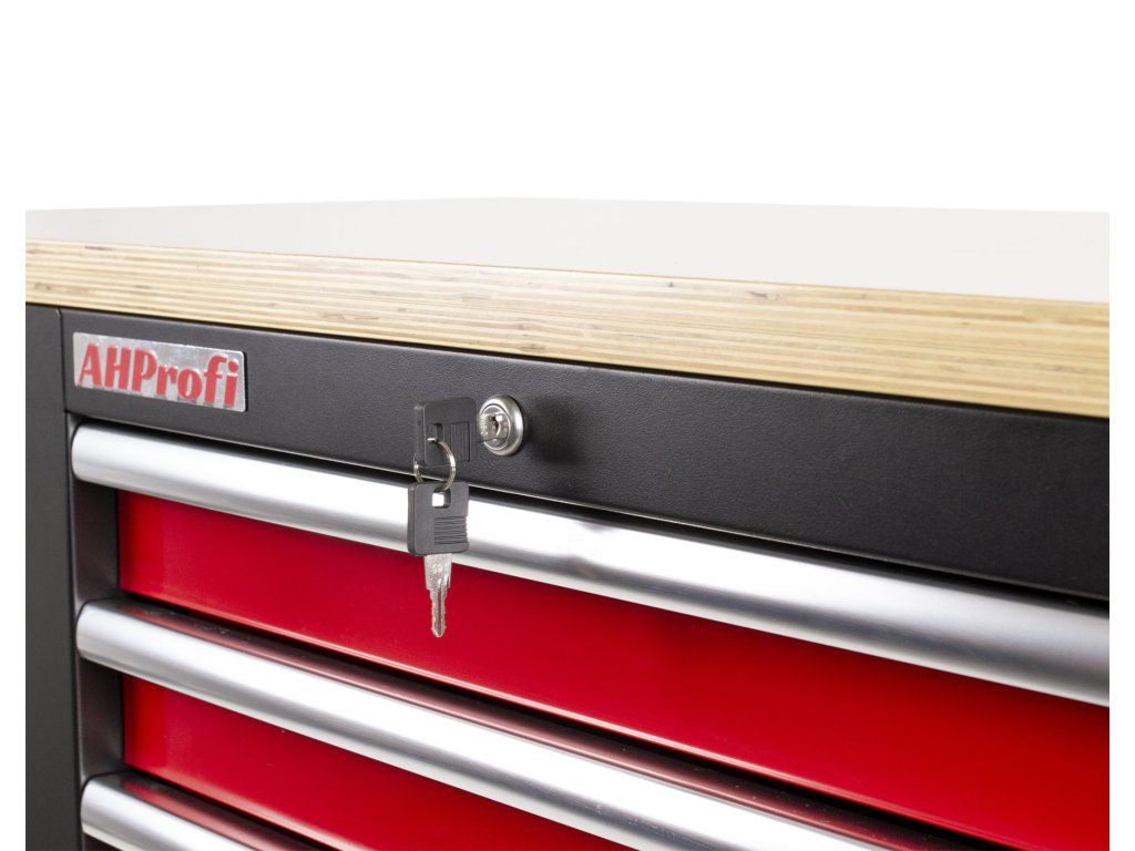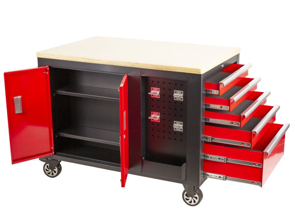 Černo-červený velký dílenský vozík s 10-ti zásuvkami o rozměrech (š x h x v): 1141 x 730 x 888 mm. Vozík je zamykatelný, má 2 pevná a 2 otočná pogumovaná kolečka a je doslova všestranný. Uskladňovací prostory má ze všech stran!