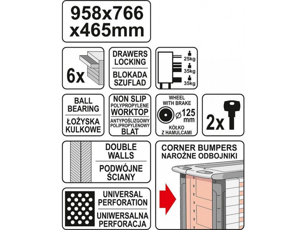 Skříňka o rozměrech 958 x 766 x 465 mm je zhotovena z oceli, celková nosnost činí 450 kg. První 3x horní zásuvky mají nosnost po 25 kg, a spodní 3 zásuvky mají nosnost 35 kg.