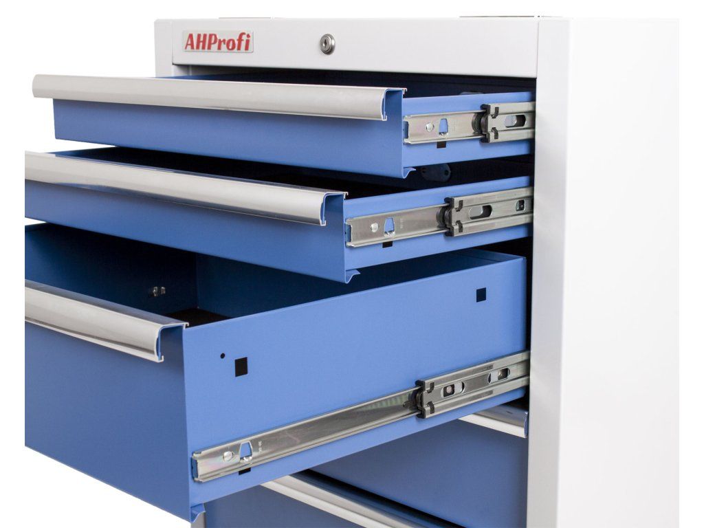 Součástí vozíku je 5 uzamykatelných zásuvek pro uložení výplní dílenského vozíku s ručním nářadím. Zásuvky jsou osazeny kuličkovými ložisky v pojezdech, čímž se zvyšuje jejich nosnost bez vlivu na výbornou vlastnost výjíždění/zajíždění.