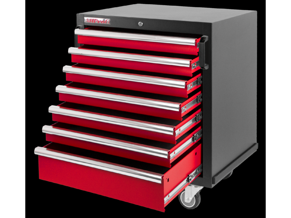 Celokovový dílenský vozík PROFI se 7 uzamykatelnými zásuvkami je ideální řešení pro maximální přehled, úložnou kapacitu a rychlou manipulaci v autoservisu, dílně i garáži.