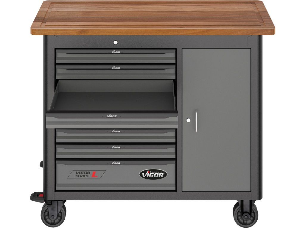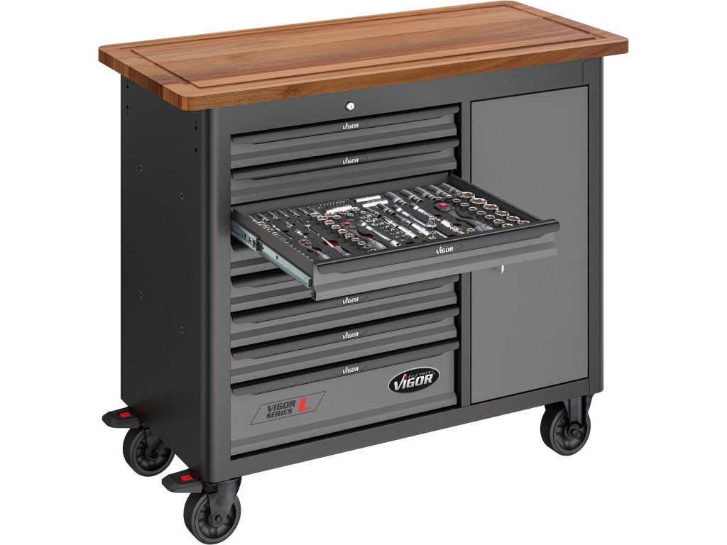 PROFI dílenský vozík s 8 uzamykatelnými zásuvkami a úložným prostorem s dvířky.