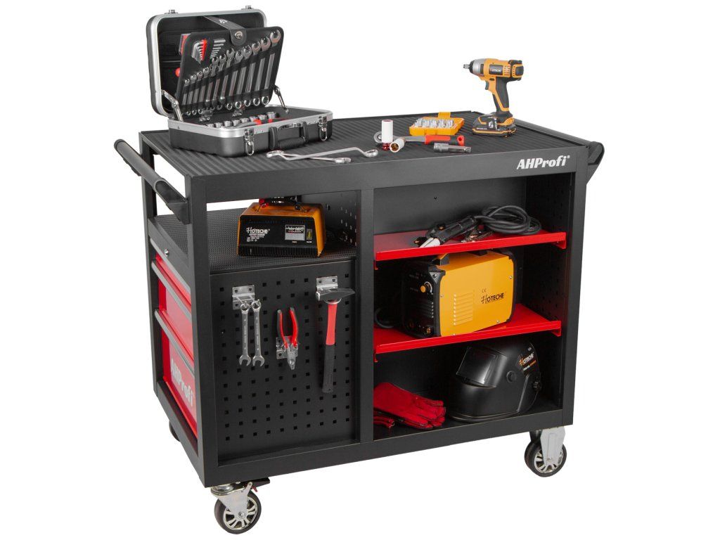 Samotný vozík je doplněn o velkou horní ocelovou desku, kterou lze využít při práci jako odkládací plochu.