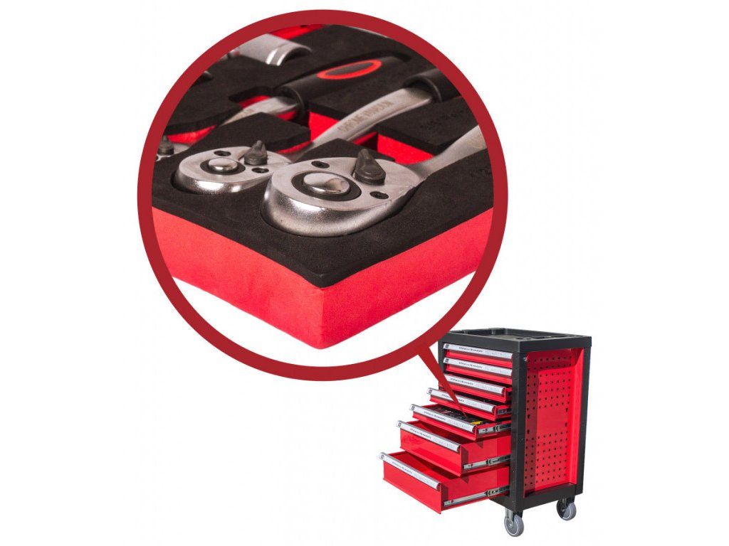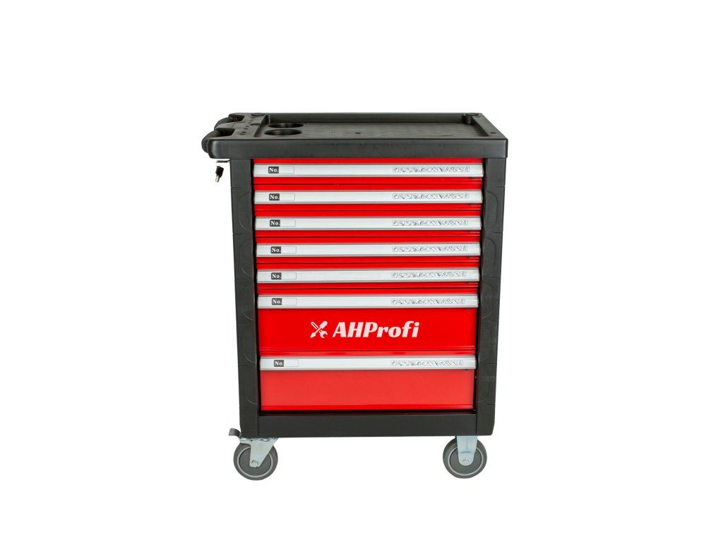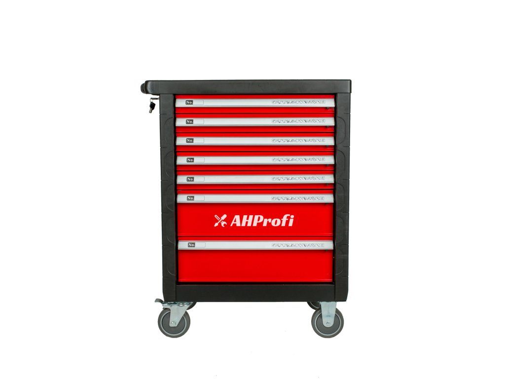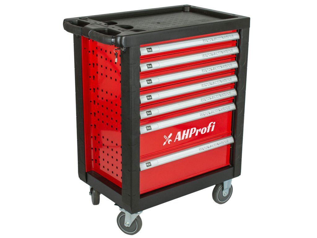 Červený dílenský vozík se 7-mi zásuvkami a rozměrech (š x h x v): 685 x 455 x 975 mm. Vozík je zamykatelný a má 2 pevná a 2 otočná pogumovaná kolečka.