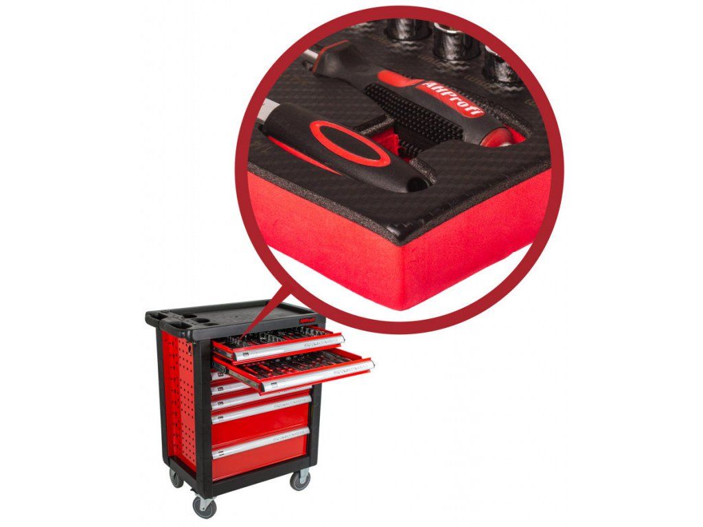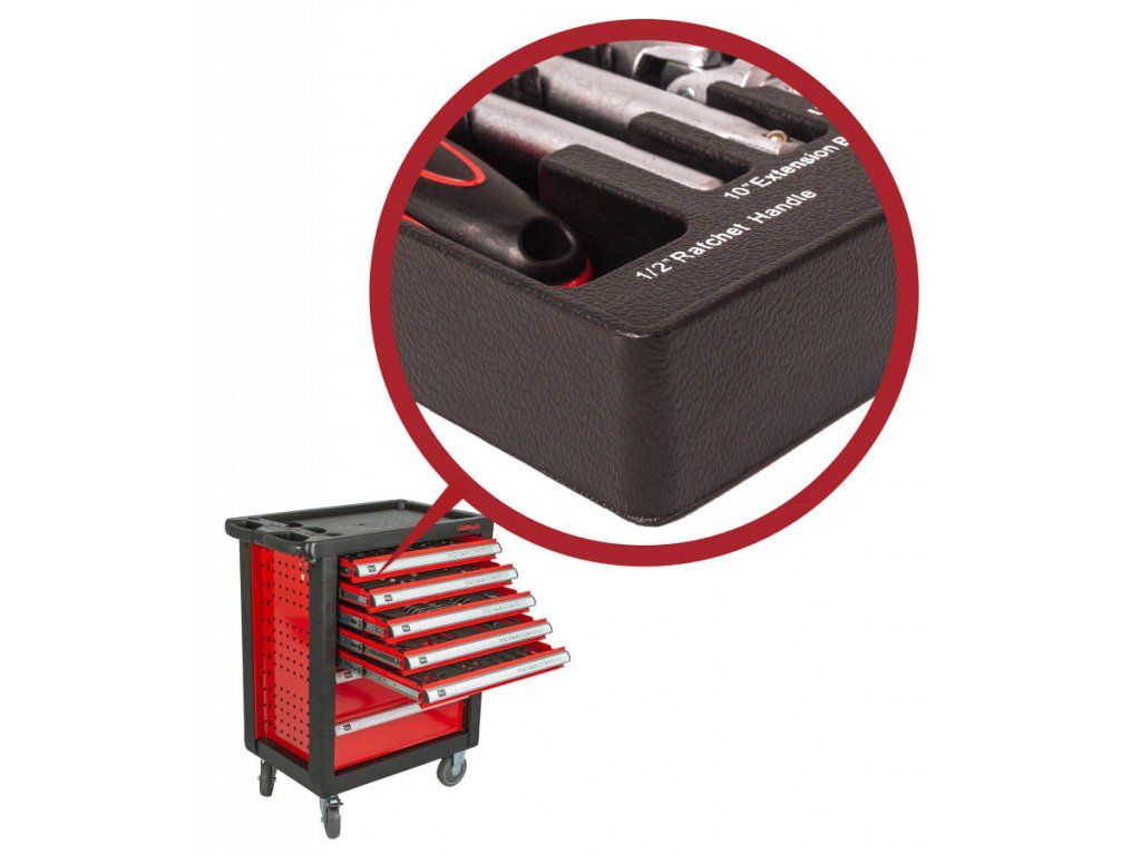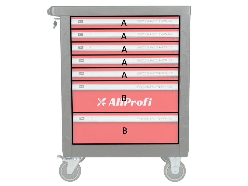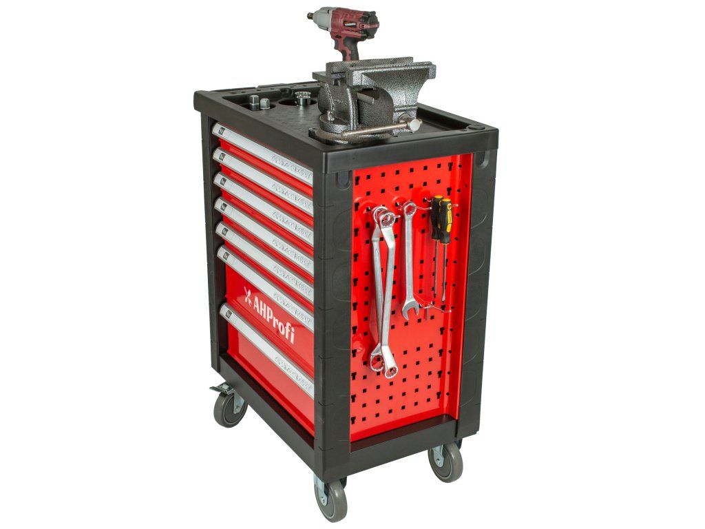 Červený dílenský vozík se 7-mi zásuvkami a rozměrech (š x h x v): 685 x 455 x 975 mm. Vozík je zamykatelný a má 2 pevná a 2 otočná pogumovaná kolečka.