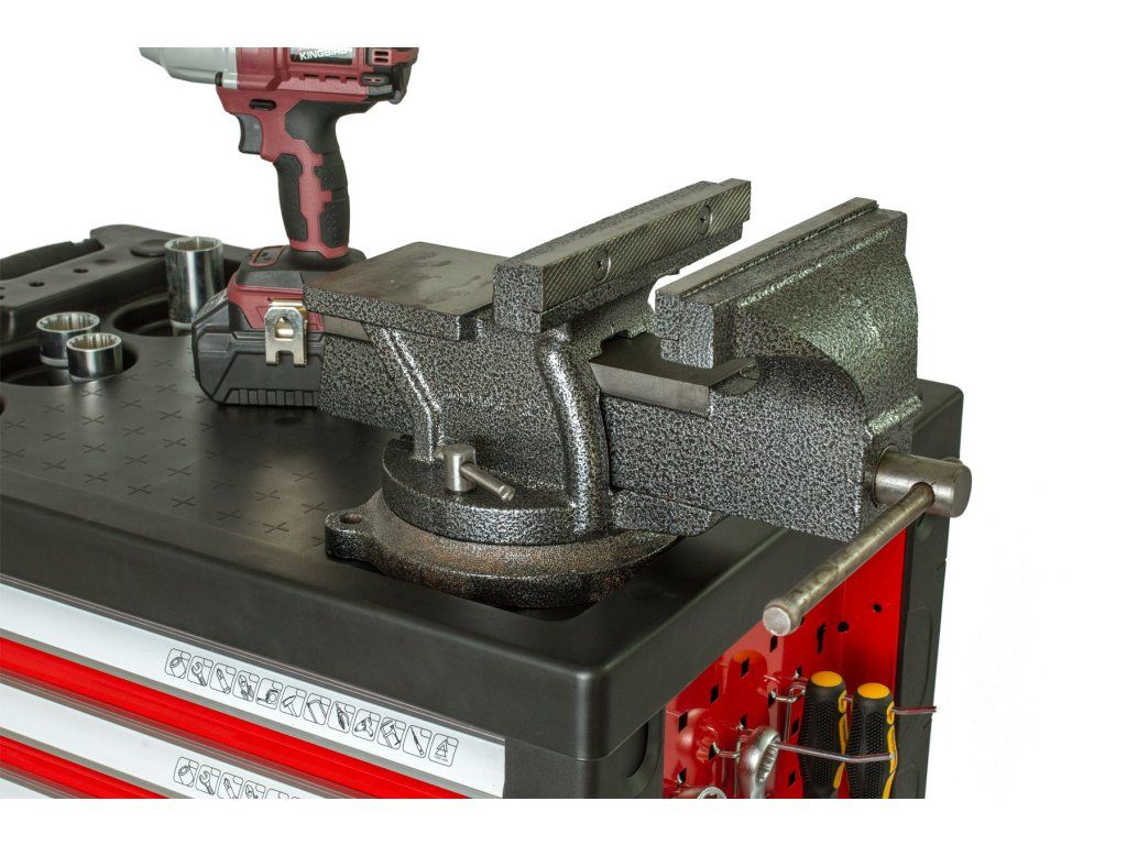 Obsahuje jímky na drobný materiál, místo pro svěrák a dírky na bity.