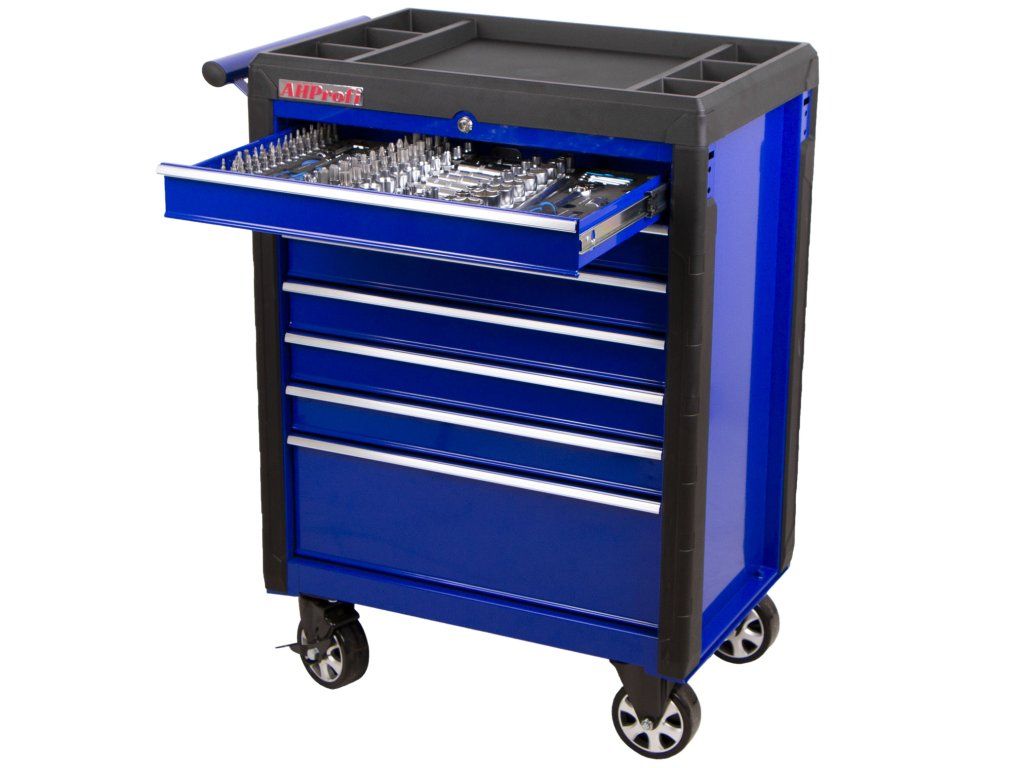 Pojízdný kovový dílenský vozík se 7 šuplíky vybavených 210 ks nářadí v pěnových výplních se bude hodit nejednomu profíkovi nebo kutilovi do jeho dílny.