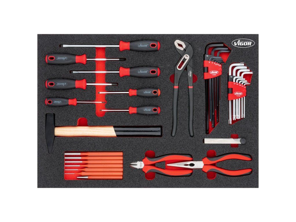 V zásuvkách jsou pěnové výplně dílenských vozíků s běžně používaným nářadím v profesionální kvalitě. V sadách nářadí naleznete golu, nástrčné klíče, kleště, kladivo, IMBUSY, velkou sadu klíčů a mnoho dalšího.