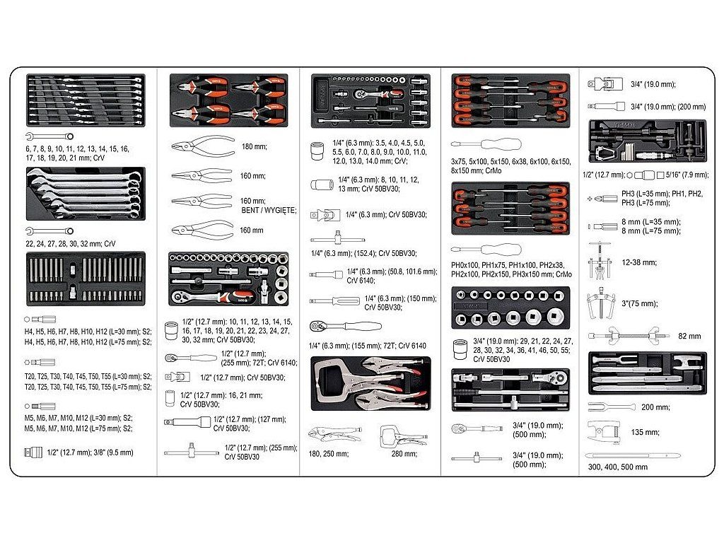 Dílenská skříňka je vybavena 7 zásuvkami s kuličkovým ložiskem, 5 horních zásuvek obsahuje 165 pečlivě vybraných nástrojů. Profily jsou vyrobeny z dvojité oceli - univerzální perforace na bocích skříňky umožňuje vybavit skříň dalšími prvky. Centrální zamykání na klíč. Skříňka je vybavena protiskluzovými kolečky s brzdami a rohovými nárazníky, které chrání proti náhodnému poškození okolí (např. karoserie automobilu). Horní deska skříňky může sloužit jako stůl, je vyrobena z protiskluzového polypropylenu.
