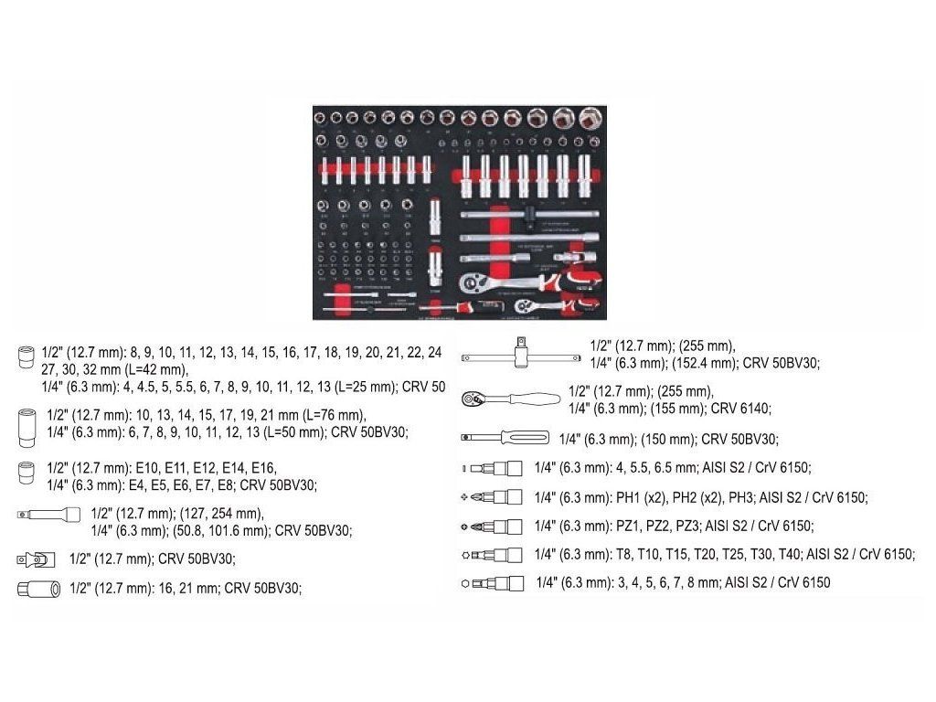 - Prodlužovací nástavce: 1/2" - 127 a 254mm, 1/4" 50,8 a 101,6mm
