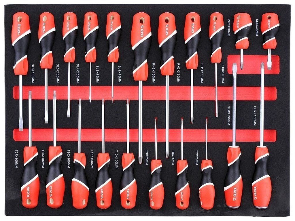 Dílenská skříňka nástrojů značky YATO, vybavena 7 zásuvkami s kuličkovým ložiskem, 5 horních zásuvek obsahuje 211 pečlivě vybraných nástrojů.