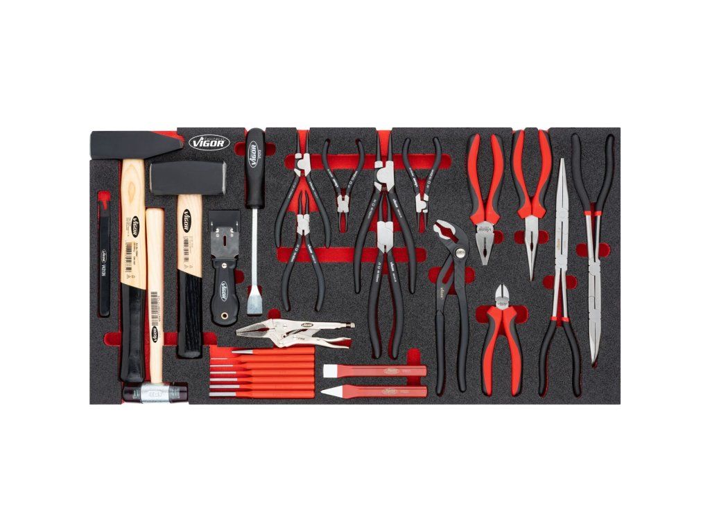 V zásuvkách jsou pěnové výplně dílenských vozíků s běžně používaným nářadím v profesionální kvalitě. V sadách nářadí naleznete golu 1/4", 1/2", 3/8", nástrčné klíče, sadu kleští, kladivo a paličku, velkou sadu šroubováků (klasické, elektrikářské i hodinářské), IMBUSy, velkou sadu očkoplochých klíčů a mnoho dalšího.