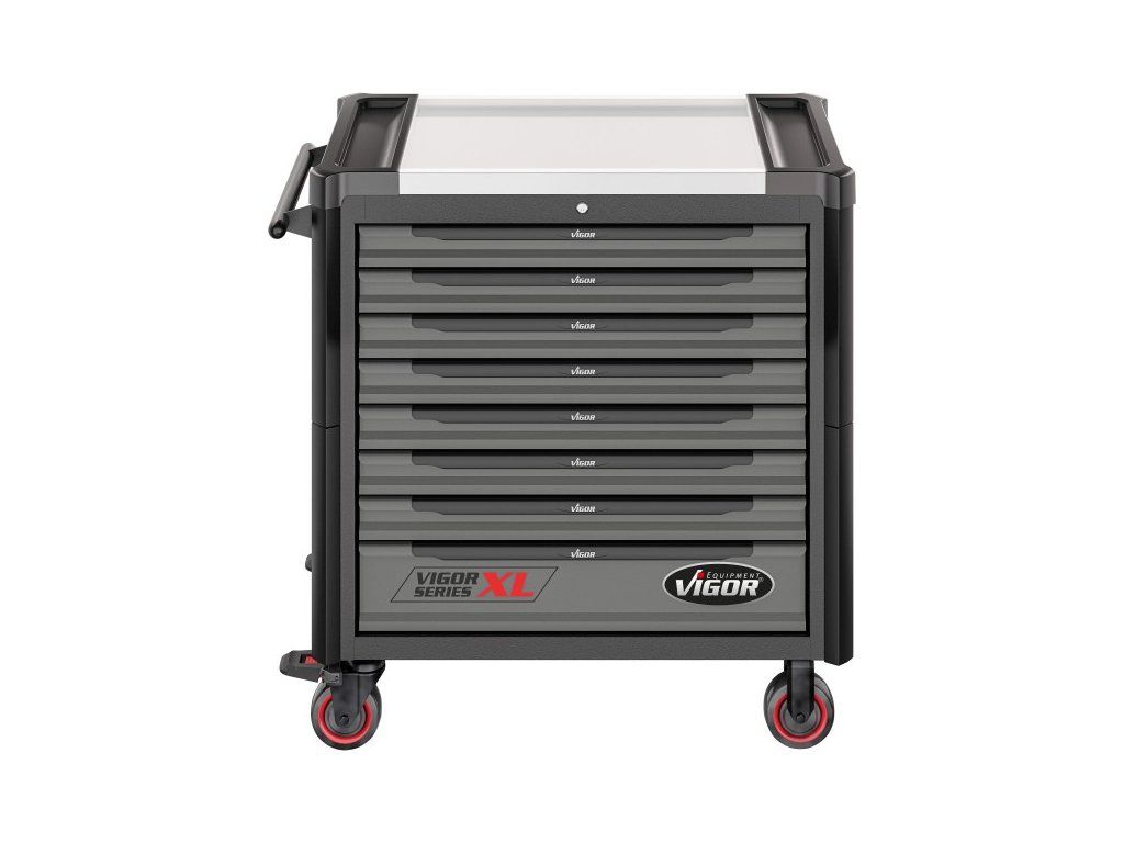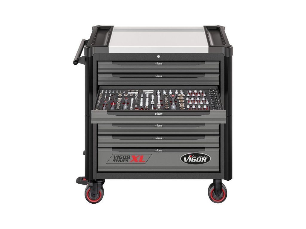 Profesionální dílenský vozík s 375 ks nářadí od německé značky Vigor.