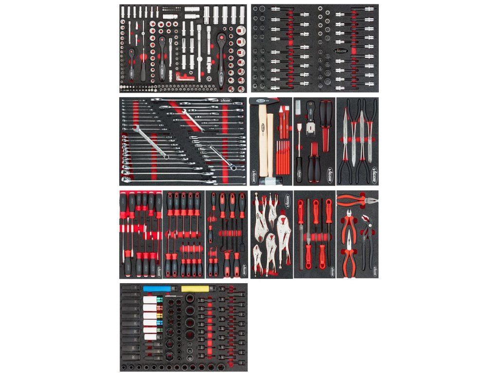 Dílenský vozík s 442 kusy profesionálního nářadí, uložených v 7 pěnových výplních. Slouží pro přehlednou a mobilní organizaci nářadí v profesionálních i servisních dílnách.