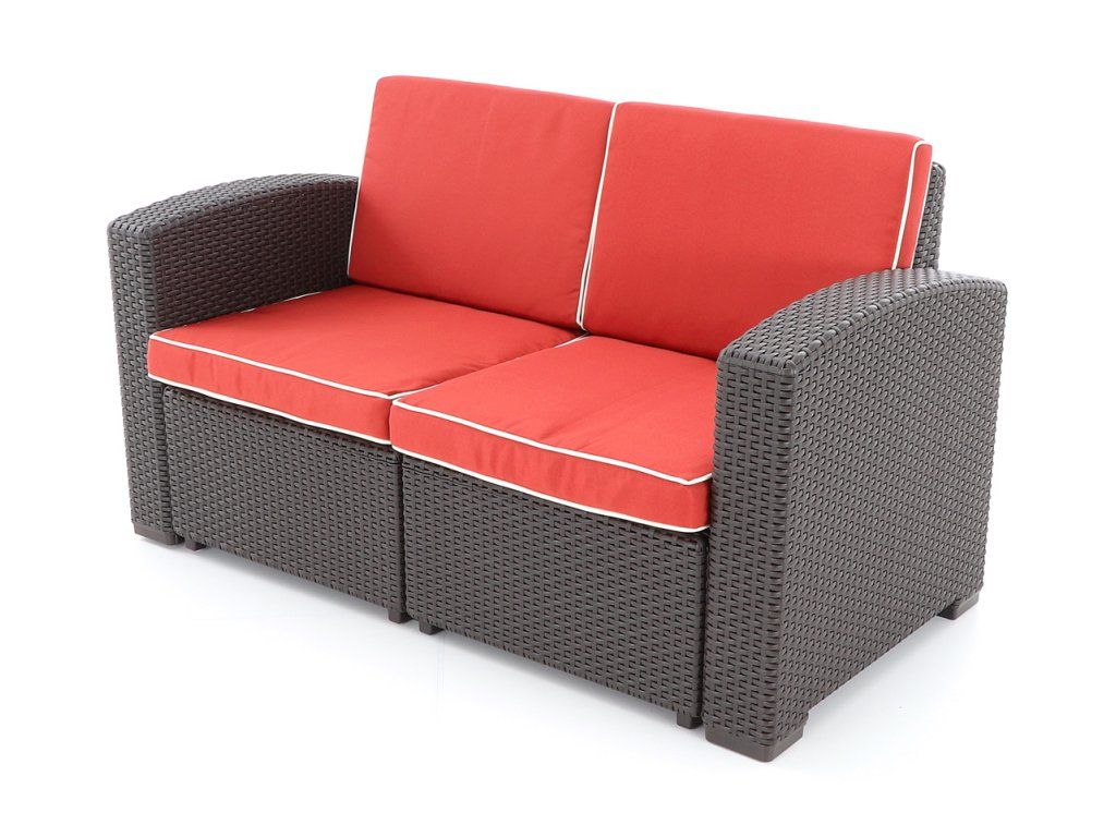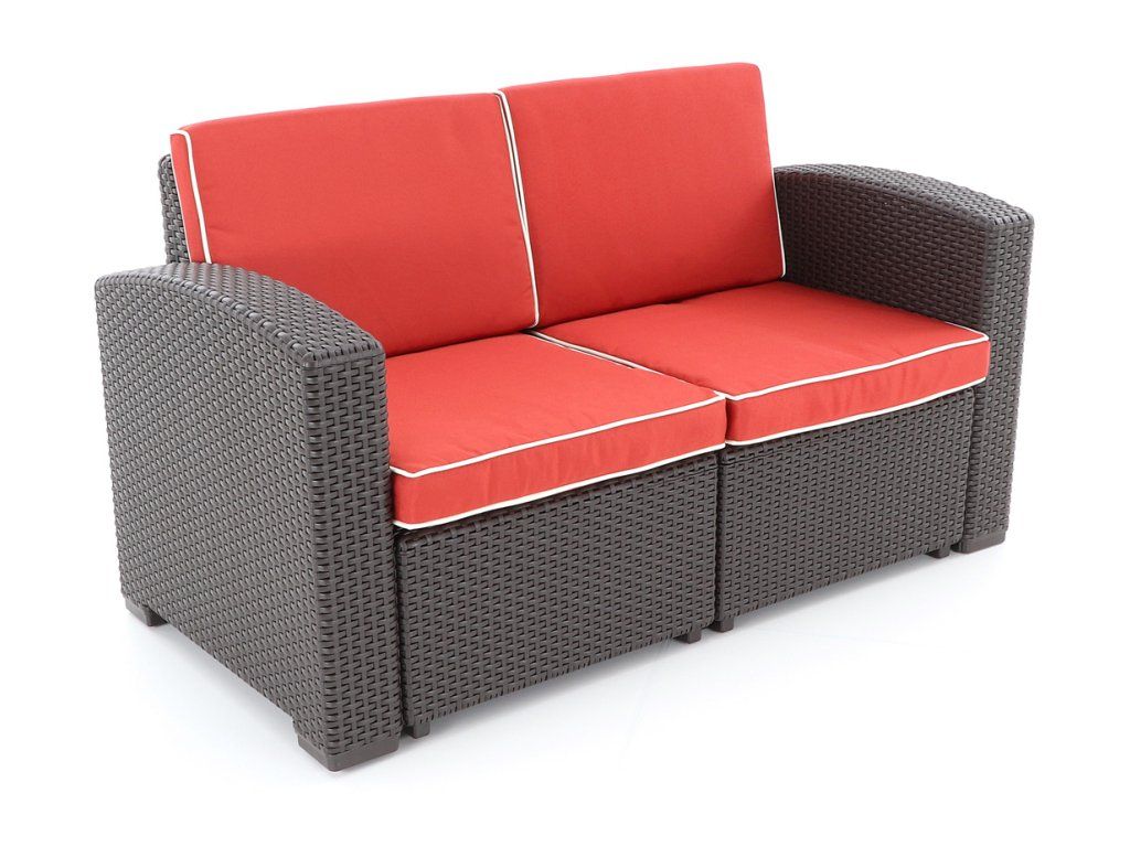Barva konstrukce hnědá, polstry jsou červené barvy.