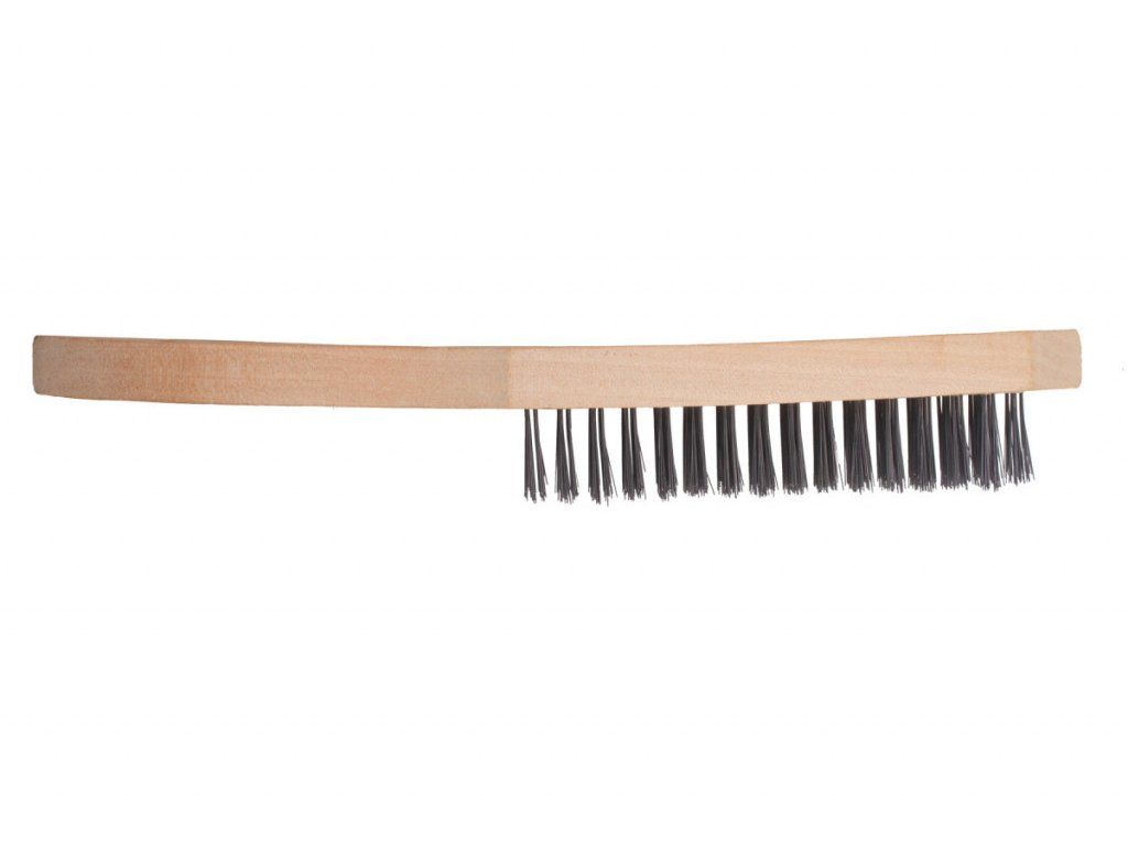 Dřevěný drátěný kartáč je vhodný na odstranění hrubých nečistot z kovů a jiných odolných materiálů. Ruční kartáč je osazen řadou ocelových štětin.