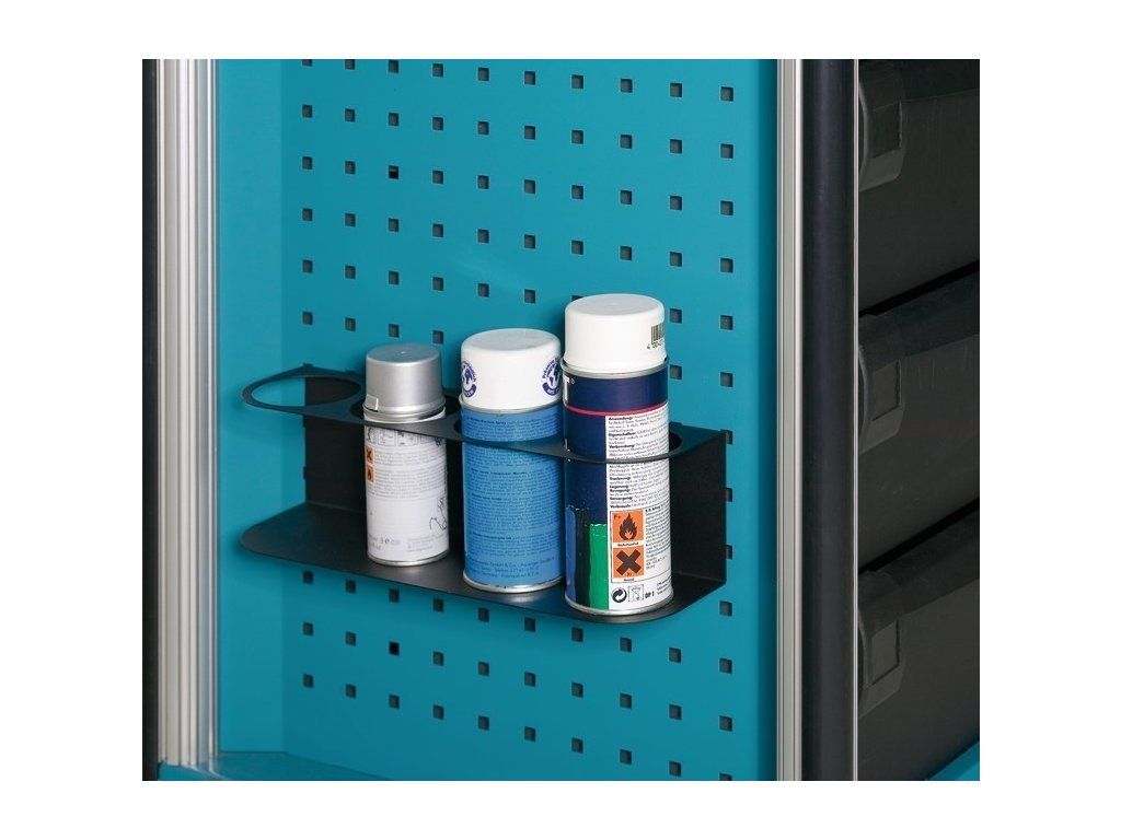 Držák nádobek je určen pro děrované desky s roztečí 38 x 38 mm. Připevněním na perforovaný panel lze rozšířit úložný prostor také pro sestavy dílenského nábytku, dílenské vozíky s nářadím i bez nářadí, pracovní stoly i policové regály.